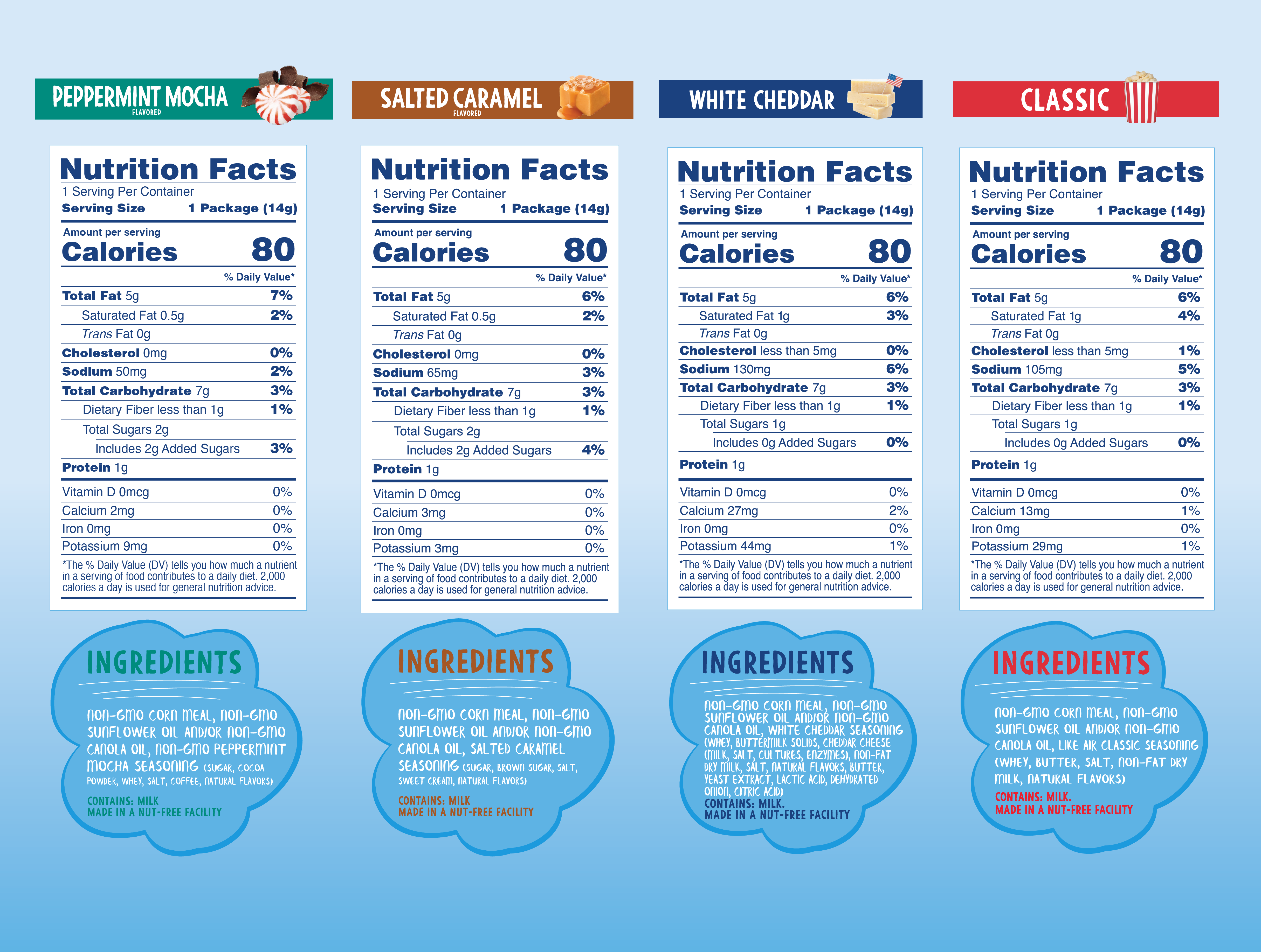 1 serving per container | Serving Size: 1 Package (14g)Calories: 80, Total Fat: 5g 7%, Saturated Fat: 0g 2%, Trans Fat: 0g, Cholesterol: 0mg 0%, Sodium: 50mg 2%, Total Carbohydrate: 7g 3%, Dietary Fiber: less than 1g 1%, Total Sugars: 2g, Includes 2g Added Sugars: 3%, Protein: 1g, Vitamin D: 0mcg 0%, Calcium: 2mg 0%, Iron: 0mg 0%, Potassium: 9mg 0%